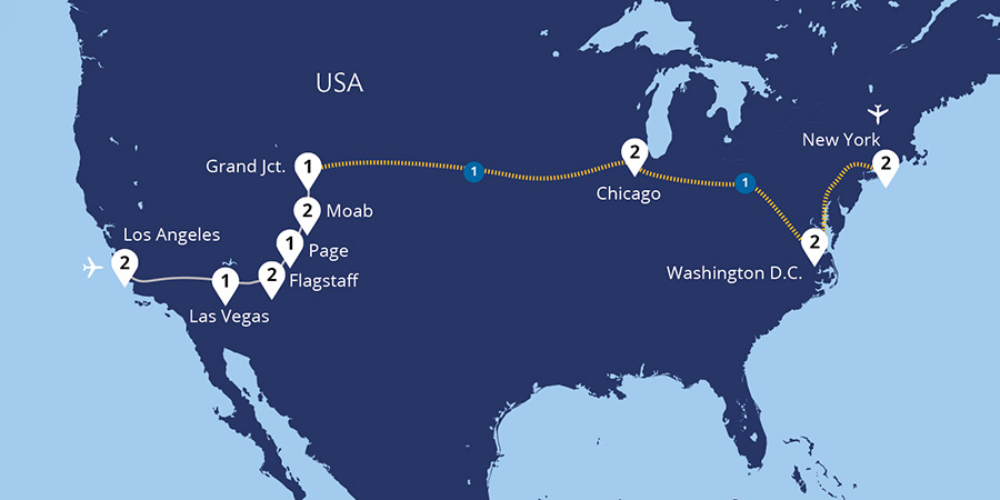 Experience a once-in-a-lifetime journey as we travel from ocean to glimmering ocean across the USA, from dazzling Times Square to the Hollywood Hills. Enjoy guided tours of America's great cities, including New York, Washington DC, Chicago and Los Angeles, with cruises around Manhattan and the Chicago River. Travel overnight from Chicago to Grand...
