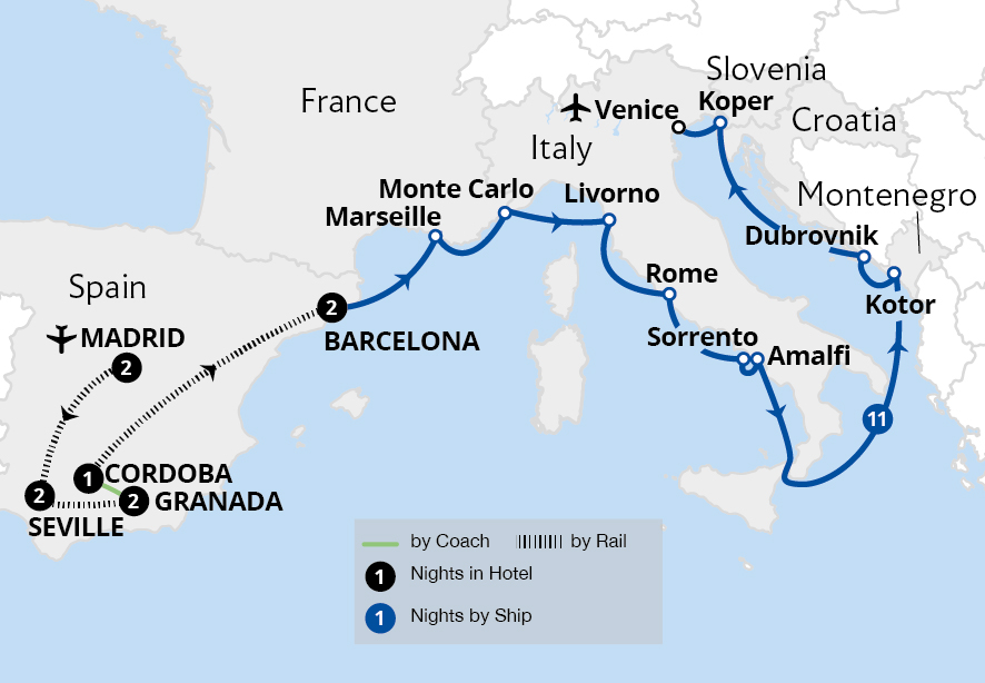 Be captivated by the wonders of Spain, Italy, Montenegro and Croatia on a remarkable holiday across land and sea. Led by an experienced Great Rail Journeys Tour Manager, discover Spain's iconic cities and sights, including Madrid's grand boulevards, Granada's striking Alhambra and Seville's magnificent Plaza de España on an escorted tour. ...