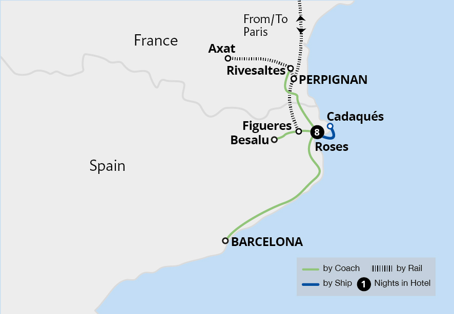 We meet at London St Pancras International and board the Eurostar to Paris in Plus class with a light meal at our seats. In the French capital, we take our seats in First Class for a journey through the heart of France to the Spanish town of Figueres. Here, we transfer by coach to our hotel which overlooks Canyelles Petites beach in the town of Roses.